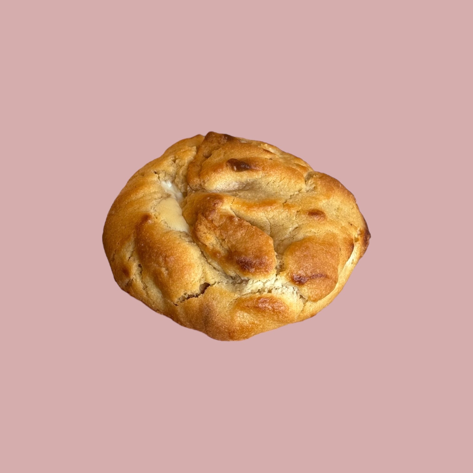 Cookie con chips de chocolate con leche, trozos de galleta dinosaurus y relleno de chocolate blanco.